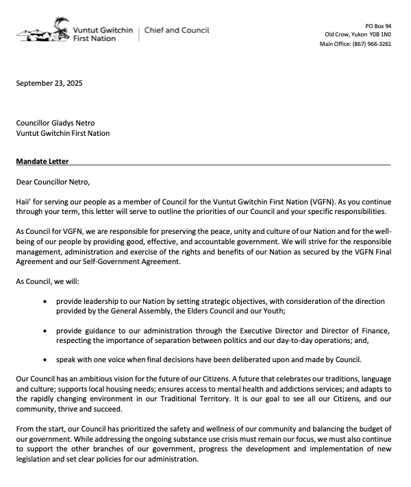 Mandate letters are also used by the Canadian and Yukon governments. These mandate letters give VGFN another tool in the context of its ongoing intergovernmental negotiations and lobbying.